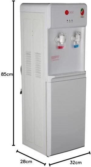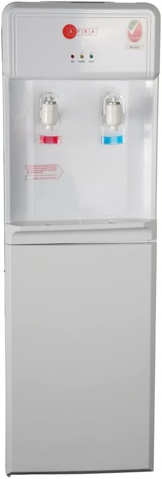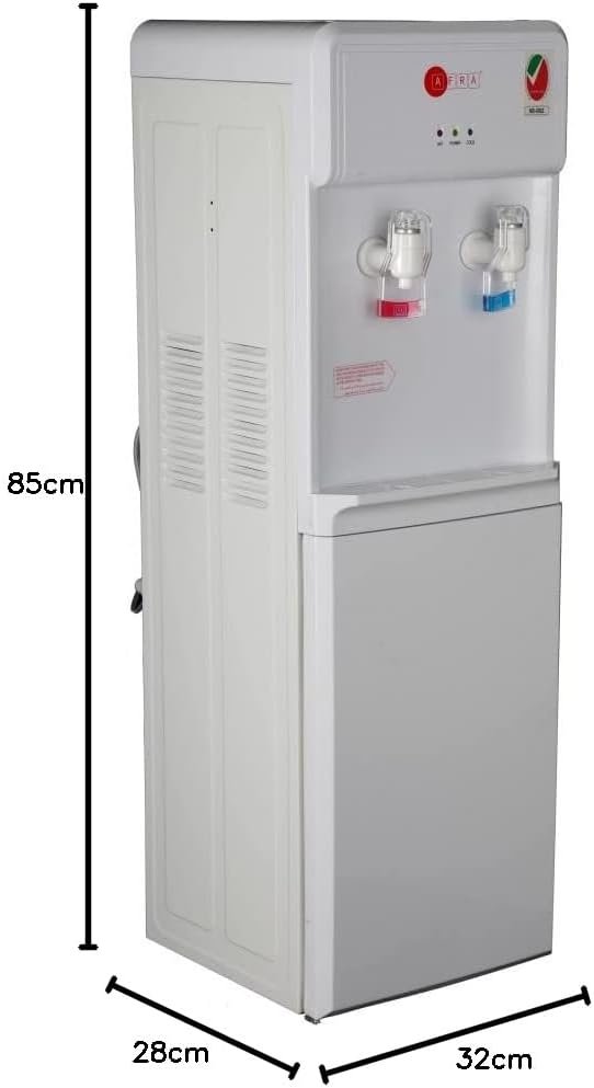 The AFRA Water Dispenser combines powerful performance with practical features. With a total power rating of 630W, it efficiently heats water at 5L/hr and cools at 2L/hr. The double thermostat ensures safety by preventing overheating, while the rust-proof stainless steel tank and high-efficiency compressor contribute to durability and energy savings. The top-loading design and built-in storage cabinet add convenience, making it suitable for both home and office use. Certified with CFC-free R134A gas, this dispenser is both eco-friendly and effective, supported by a 2-year warranty for added assurance. 2-Year Warranty “For Operational Instructions, Optimal Safety, And Performance, Please Read the User Manual Thoroughly Before Using This Device”