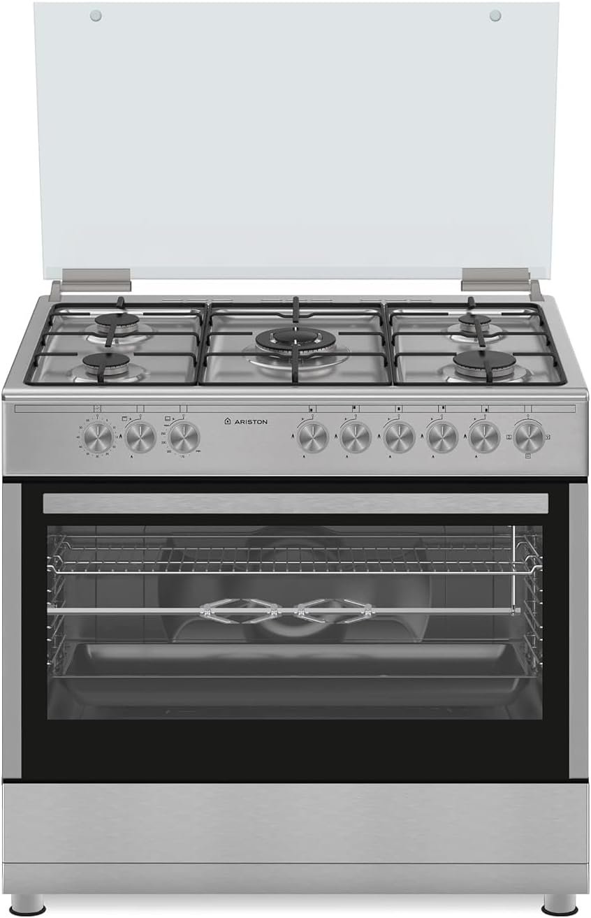 Special Features : ● 5 Gas burners Including Triple Crown(Sabaf), ● Automatic One Hand ignition, ● Cast Iron grids, ● Deep tray, Skewer Turnspit, ● Full glass inner door